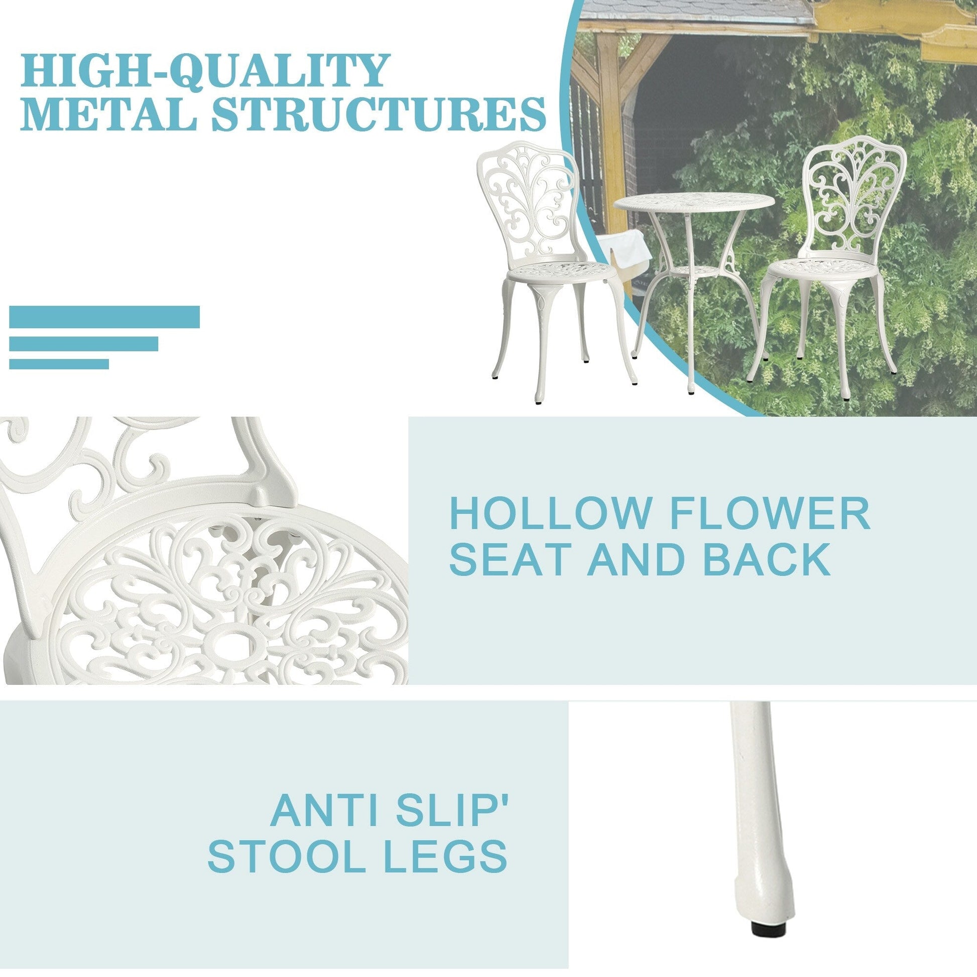 Enjoy your outdoor space with this 3-piece aluminum bistro table set, featuring exquisite butterfly carvings and antique copper finishes. Made of durable cast aluminum with anti-rust and weatherproof treatment, this set is suitable for all-weather use and can withstand oxidation. With a built-in 1.75 inch umbrella hole, you can add a 7.5-foot umbrella (not included) to protect you from the sun and rain. Easy to clean and assemble, this set is perfect for decorating your yard, poolside, terrace, garden, or porch.