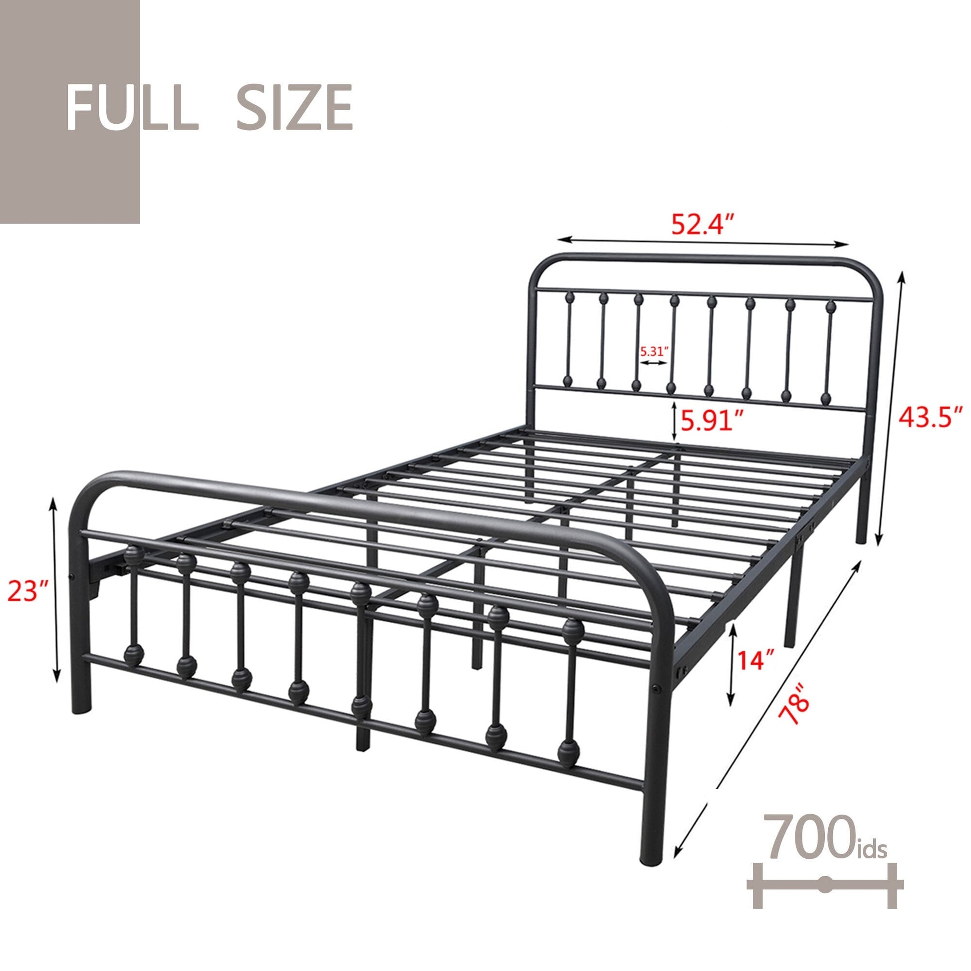- Full: 52.4 inches W x 78 inches L x 43.5 inches H