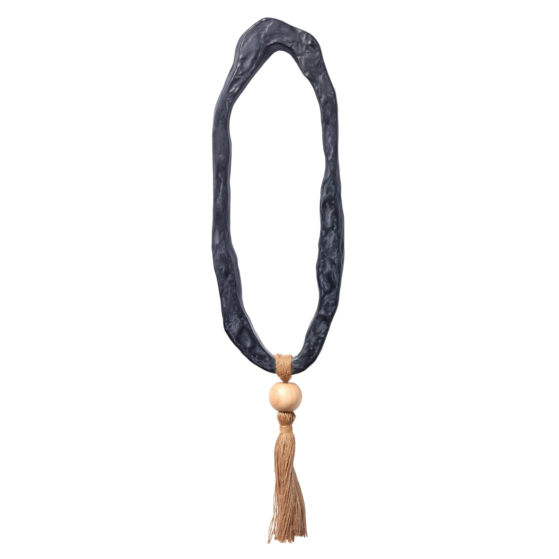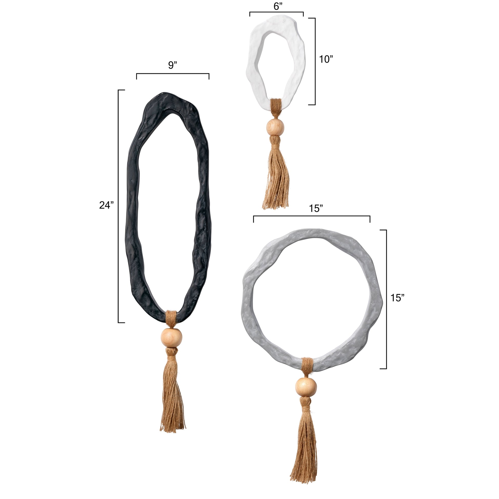 Inspired by eastern designs, this set of three decorative hangings create a striking focal poing on your wall. Hand-crafted of resin these organic free-form rings feature wooden beads and sisal rope. Hang in a decorative row or individually as here-and-there ornaments in any room in need of