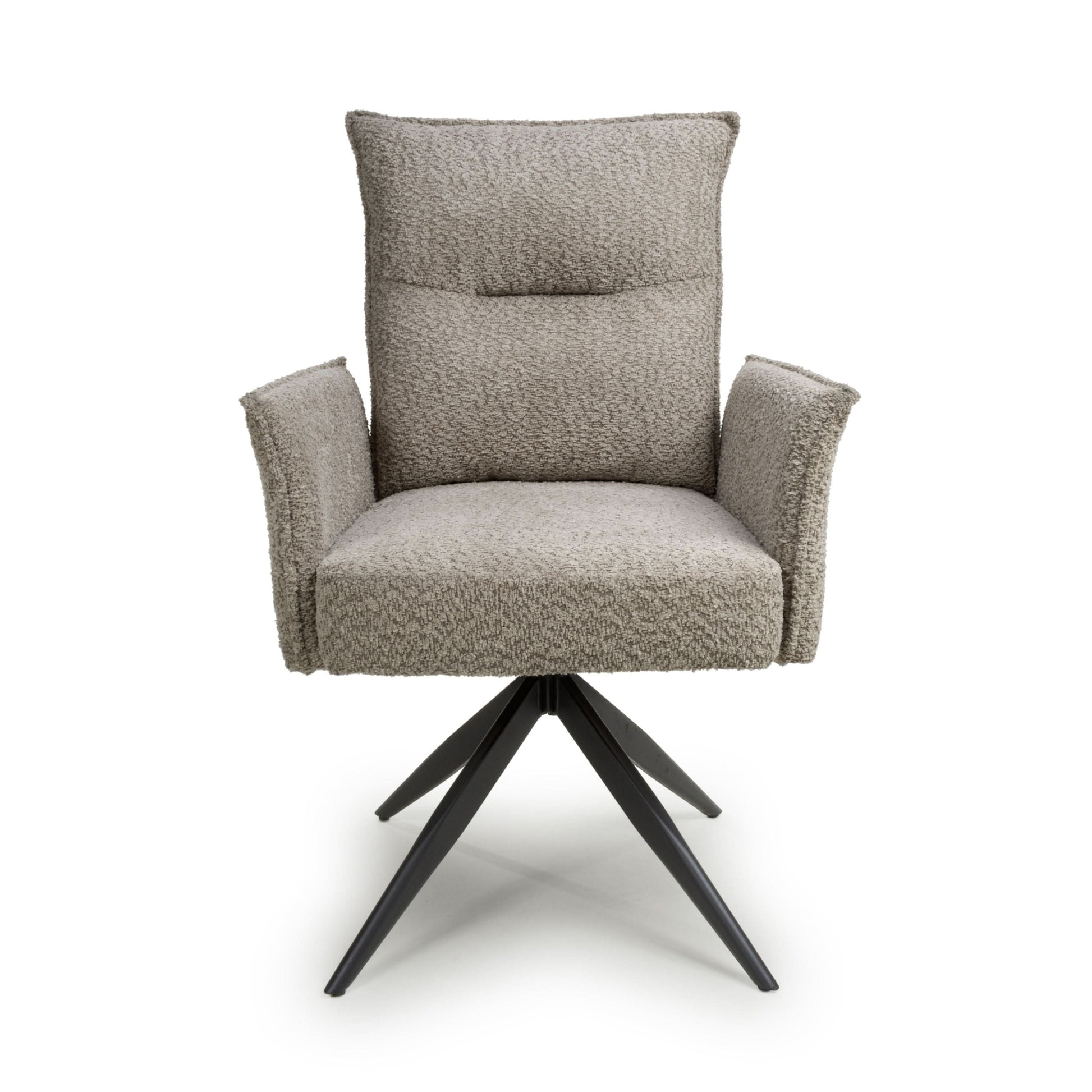 A generously proportioned dining chair, upholstered in plush, sumptuously textured mink fabric. Chunky padded cushions provide extreme support, enhanced by the ergonomic sloped backrest and gently curved rectangular armrests. Feature detailing includes ribbed edging and a rear vertical zip. The chair also swivels a full 360 degrees on its stylish black metal four leg tripod base. Assembly required. Sold in boxes of 2.