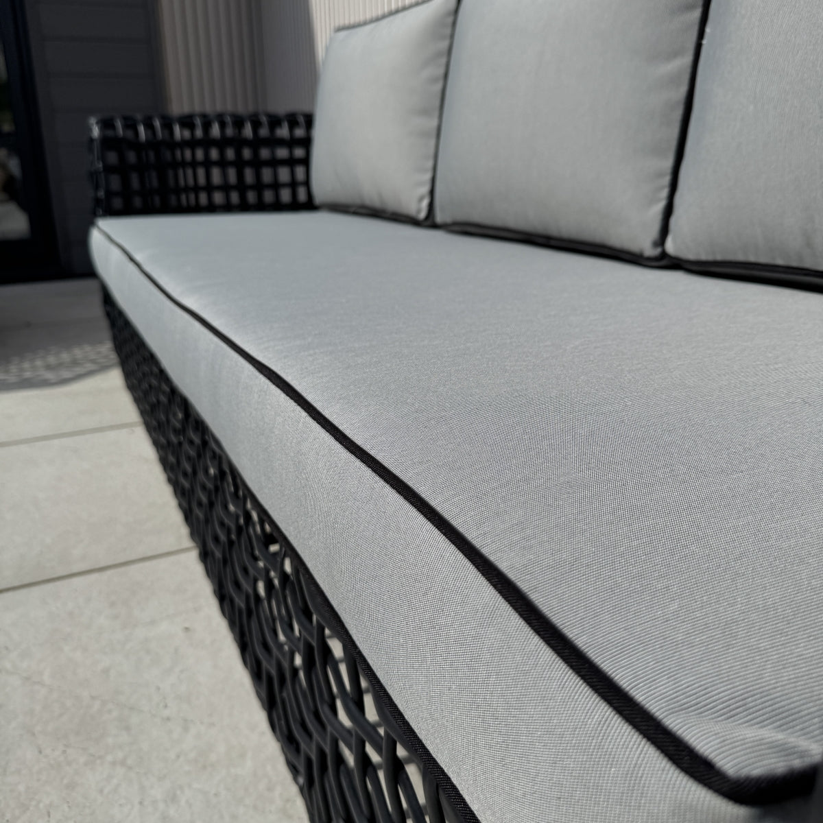 The Indi Sofa Set comes fully assembled, with a free rain cover, ensuring protection and ease of use in any season. The showerproof cushions and weatherproof PE rattan make it a low-maintenance choice for year-round comfort.
