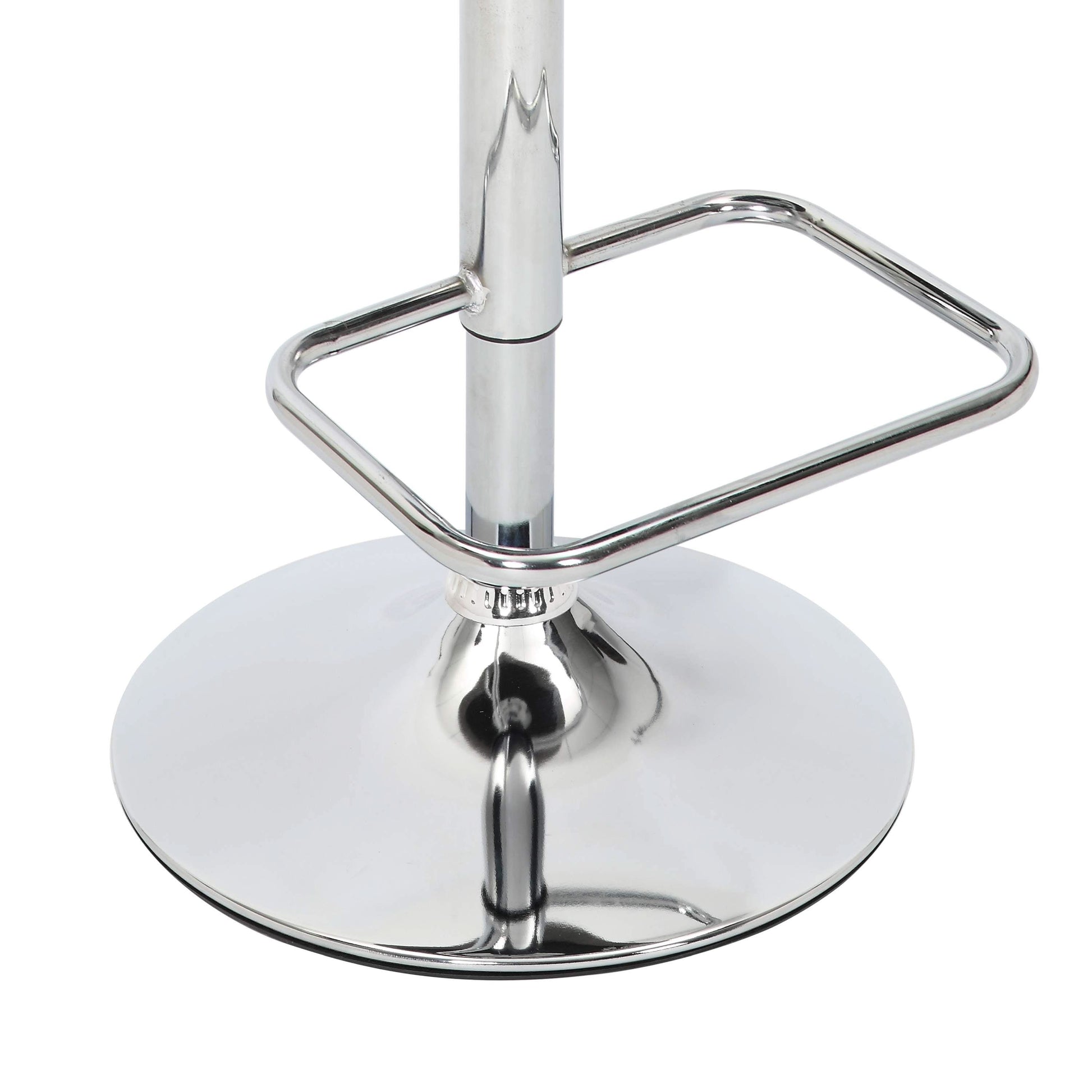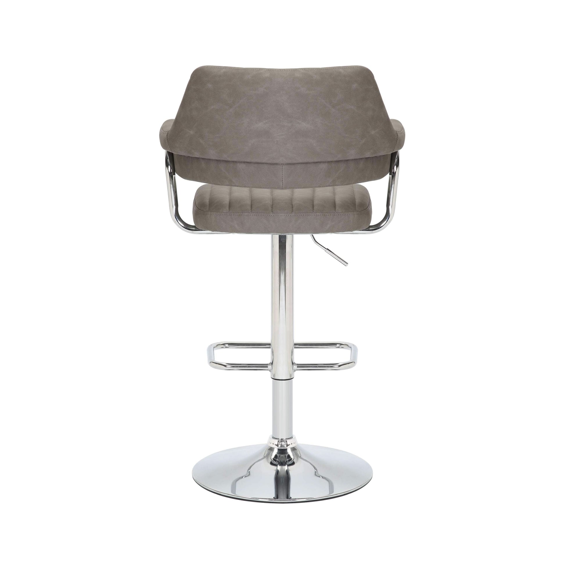 A striking contemporary bar stool, upholstered in charcoal leather effect fabric. The floating seat and back are highlighted with ribbed stitch detailing. The layered back and arm rests are supported by a feature L shaped curved chrome bar. The rounded chrome base comes fitted with a large rectangular footrest. Height adjustable between 93cm to 113cm via a gas lift mechanism. The seat also easily swivels a full 360 degrees. Assembly required. Sold in boxes of 2.