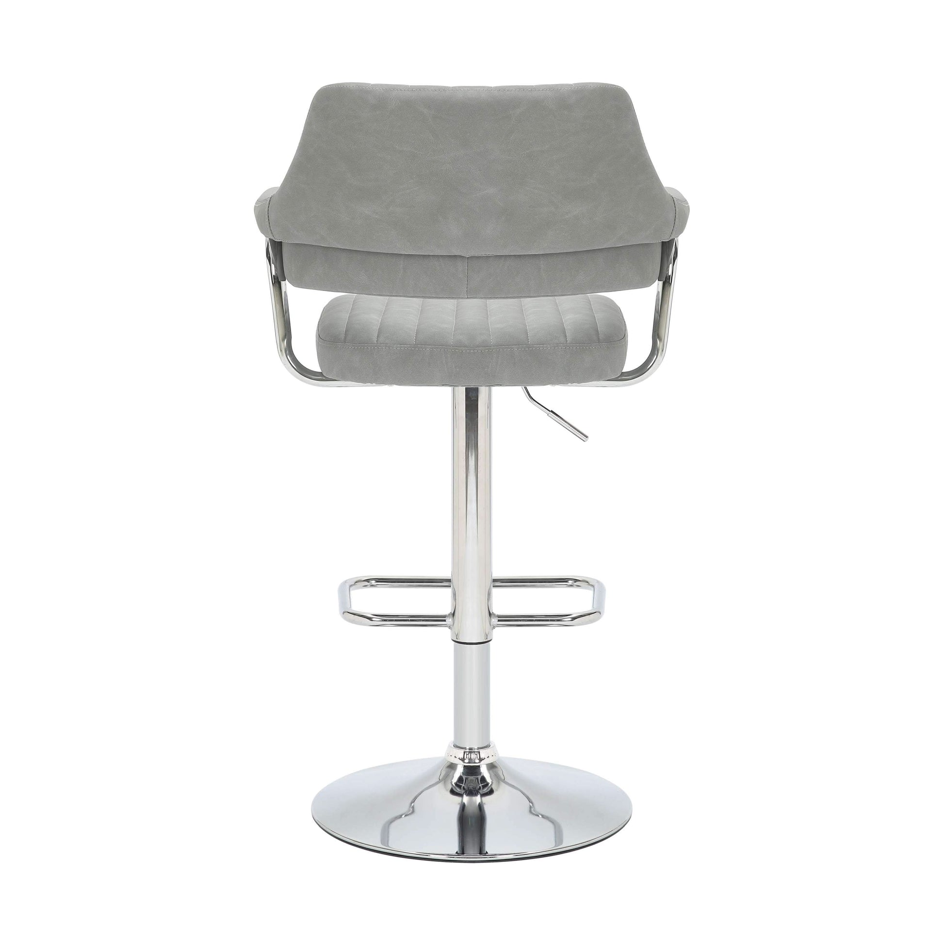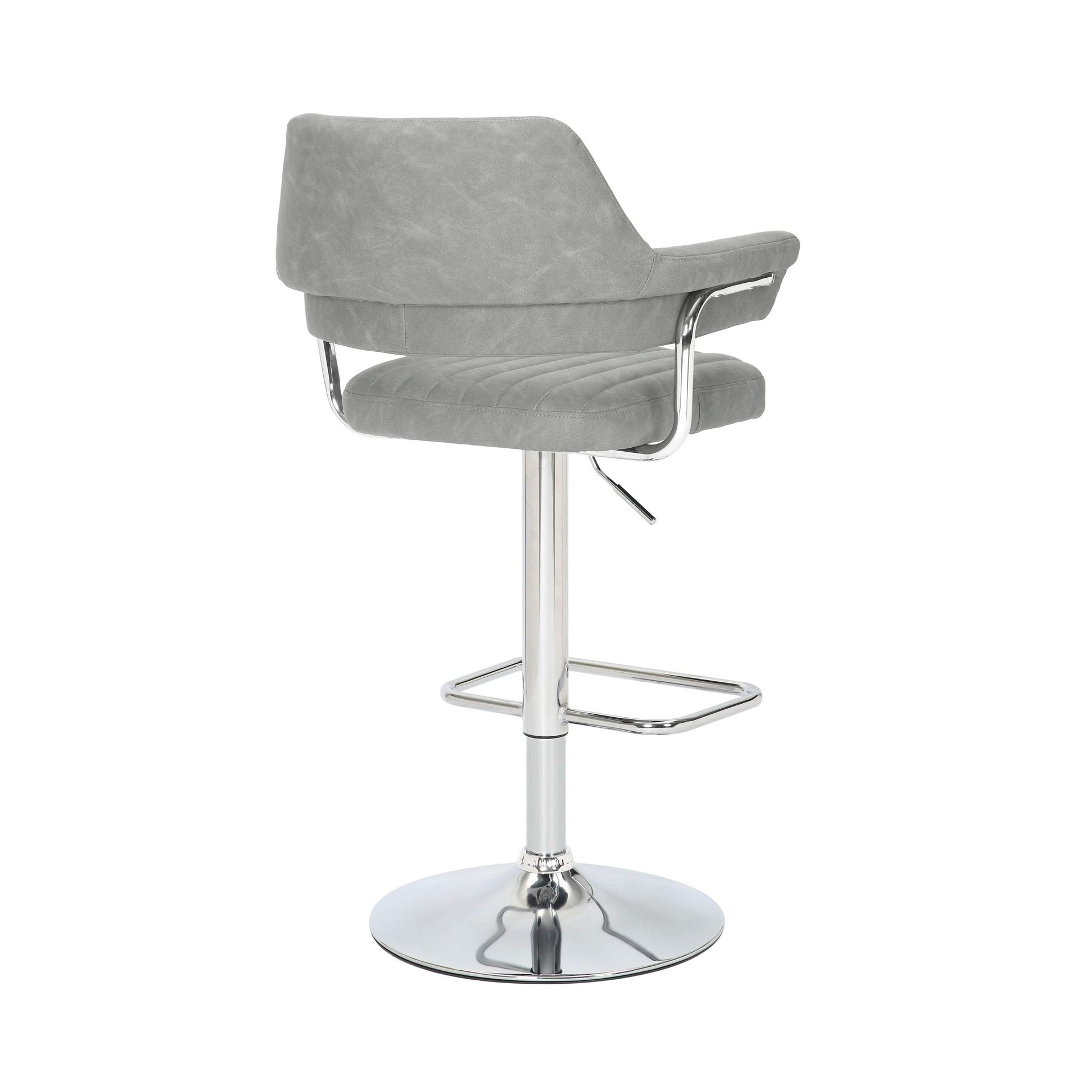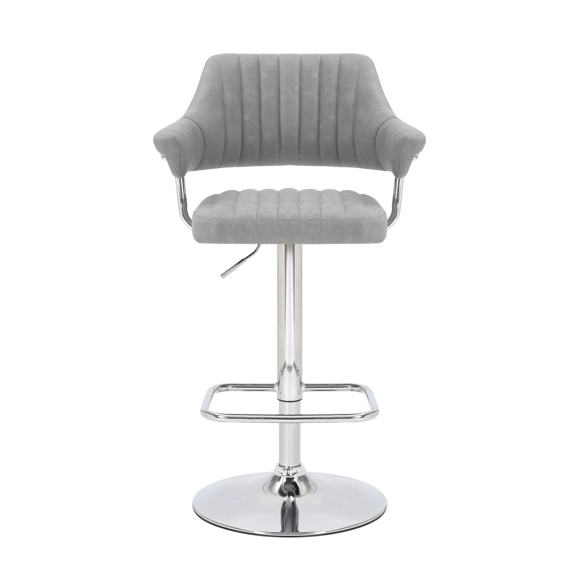 A striking contemporary bar stool, upholstered in light grey leather effect fabric. The floating seat and back are highlighted with ribbed stitch detailing. The layered back and arm rests are supported by a feature L shaped curved chrome bar. The rounded chrome base comes fitted with a large rectangular footrest. Height adjustable between 93cm to 113cm via a gas lift mechanism. The seat also easily swivels a full 360 degrees. Assembly required. Sold in boxes of 2