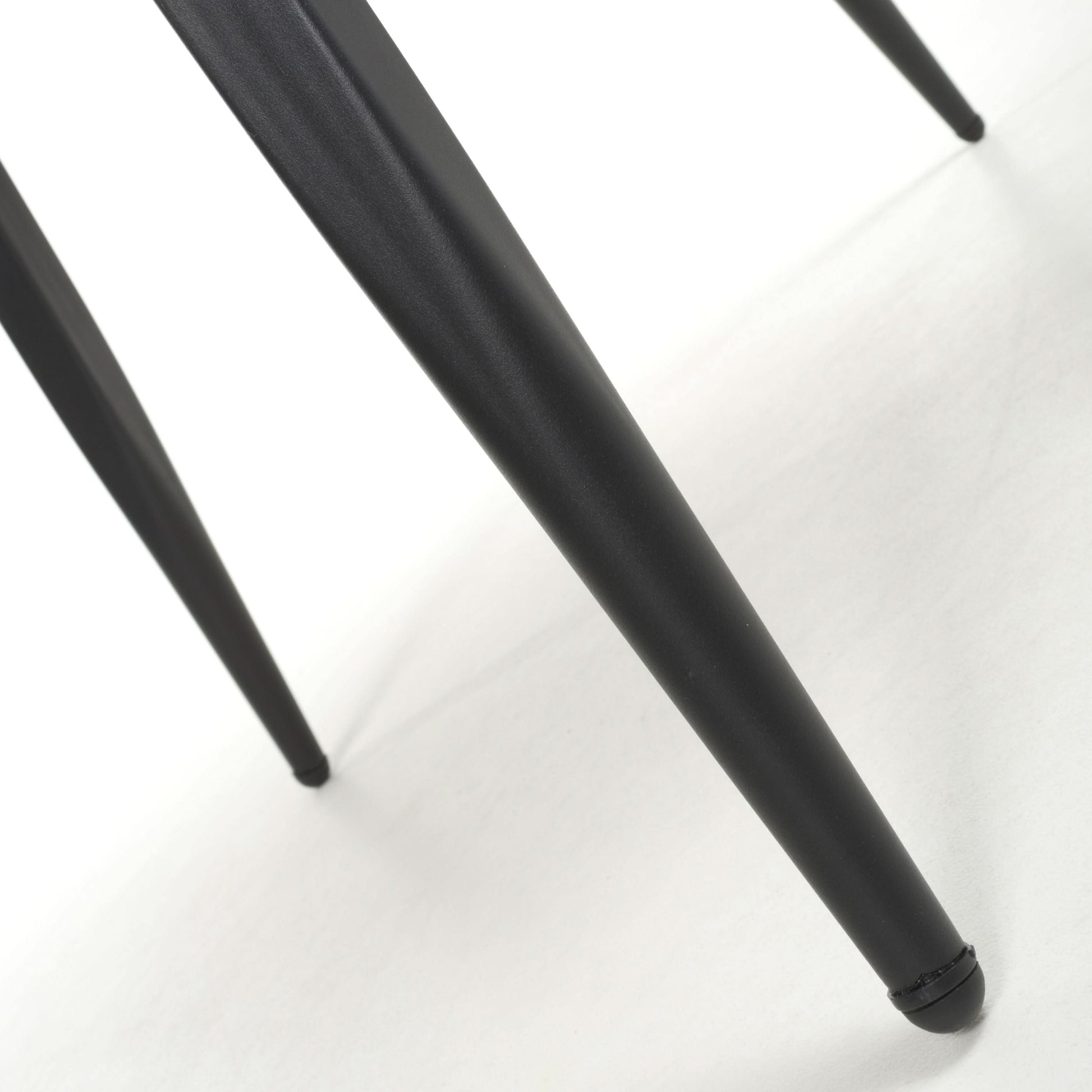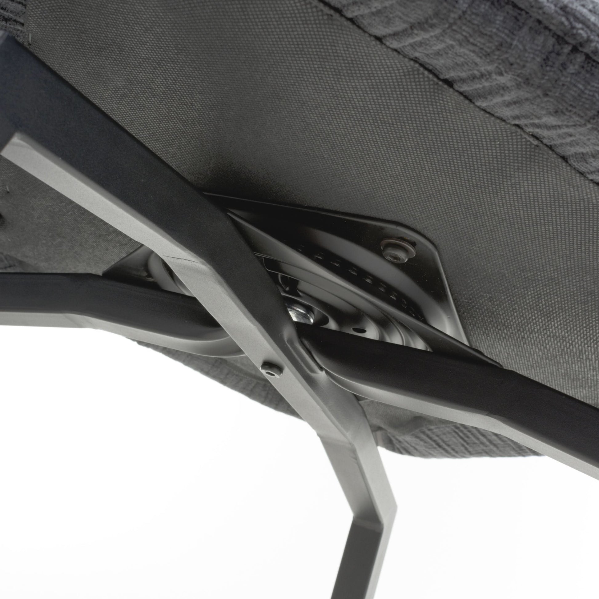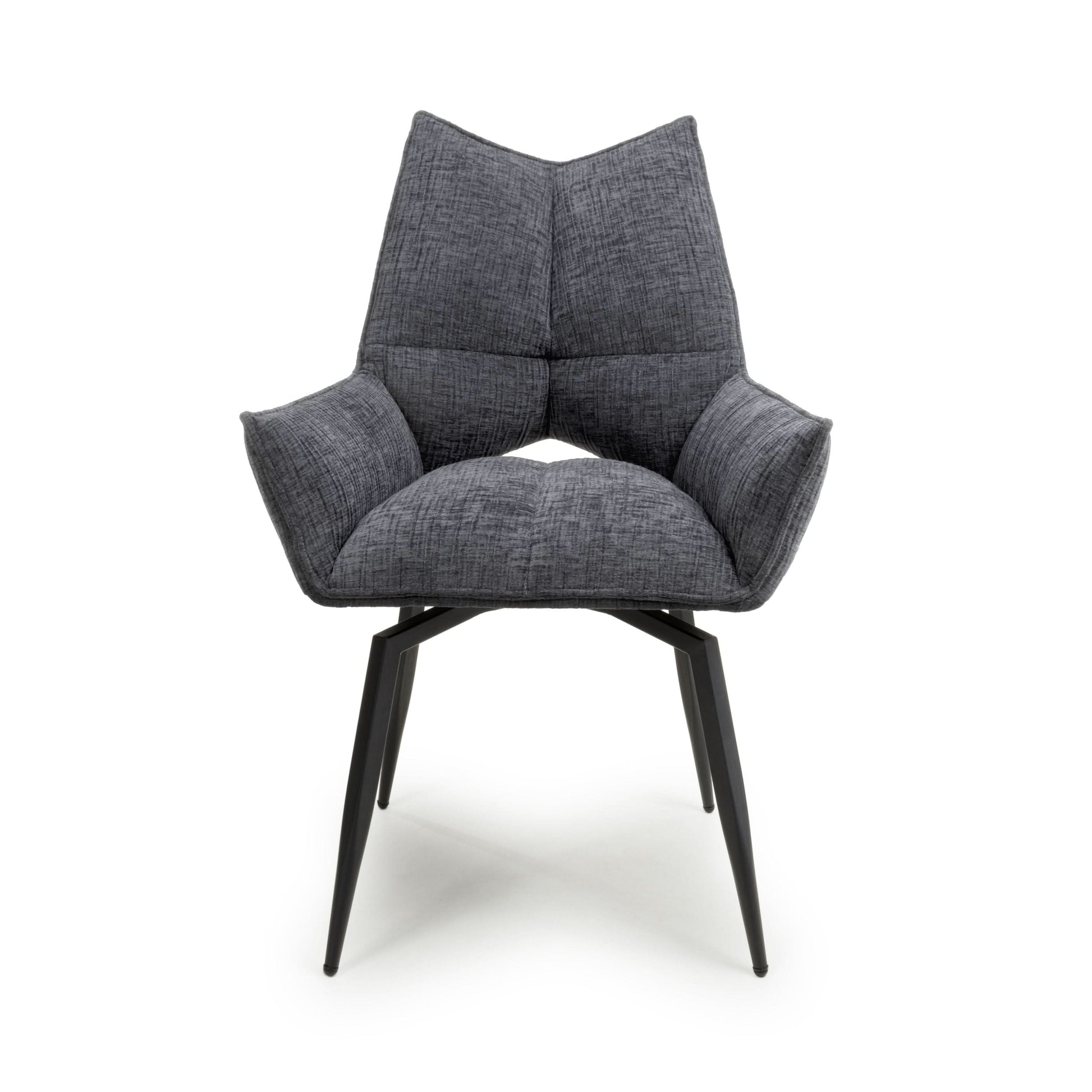 An ultra modern swivel dining chair in a striking angular design. Its pointed corners and feature triangular cutout exude contemporary style. The invitingly pleated plush dark grey upholstery comes in a subtle textured weave pattern. The seat smoothly swivels 180 degrees before gently returning to a central position. The black metal cross frame base drops down into sleek, pointed legs with adjustable feet. Assembly required. Sold in boxes of 2.