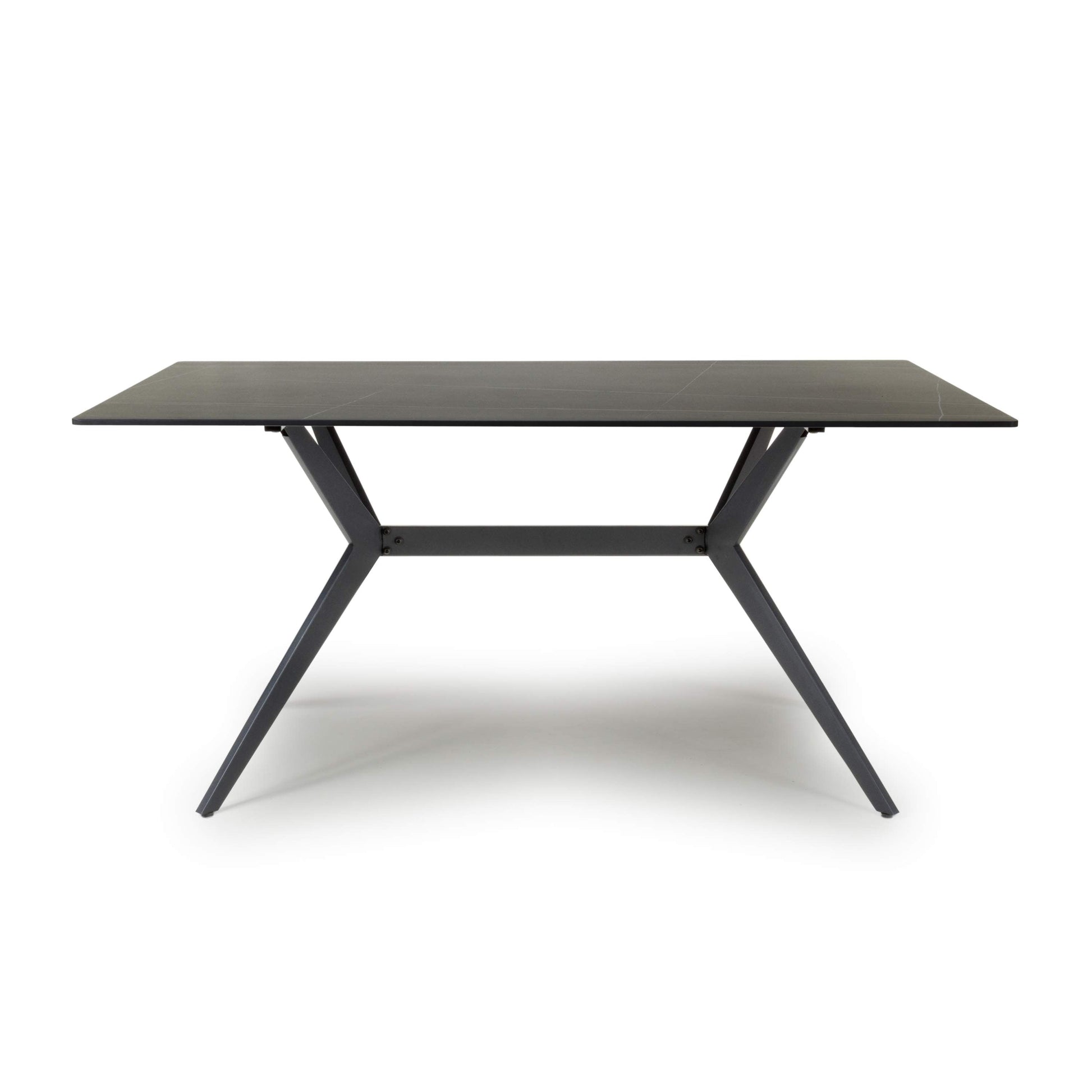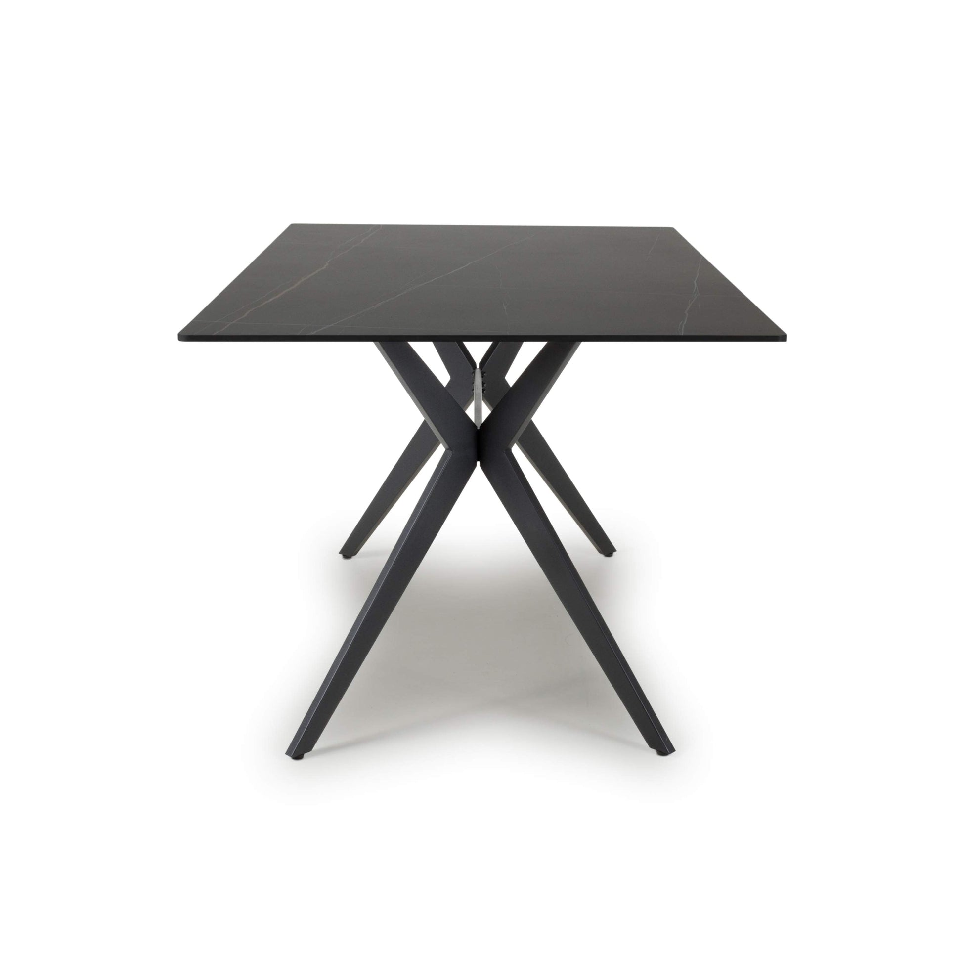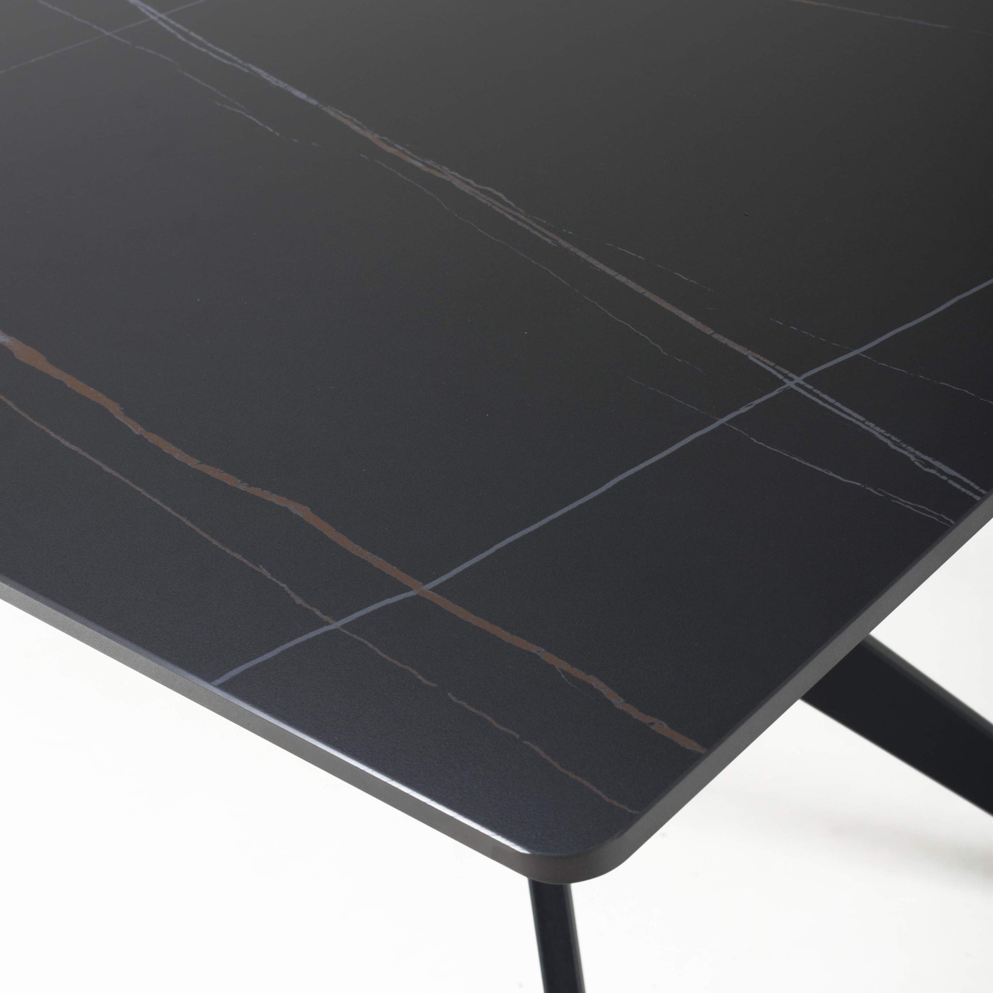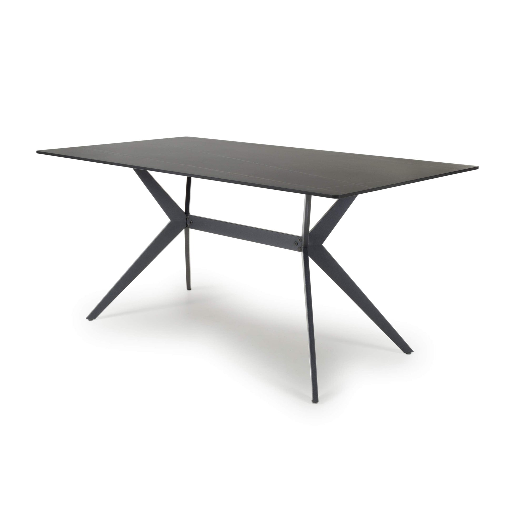 This trendsetting 1.6m sintered stone dining table is set off by fashionable diagonal orange and white criss cross markings. The sturdy 12mm thick ceramic table top comes in an attractive reflective black finish. Completed by stylish black powder coated metal X-frame legs. Assembly required. Sold individually.