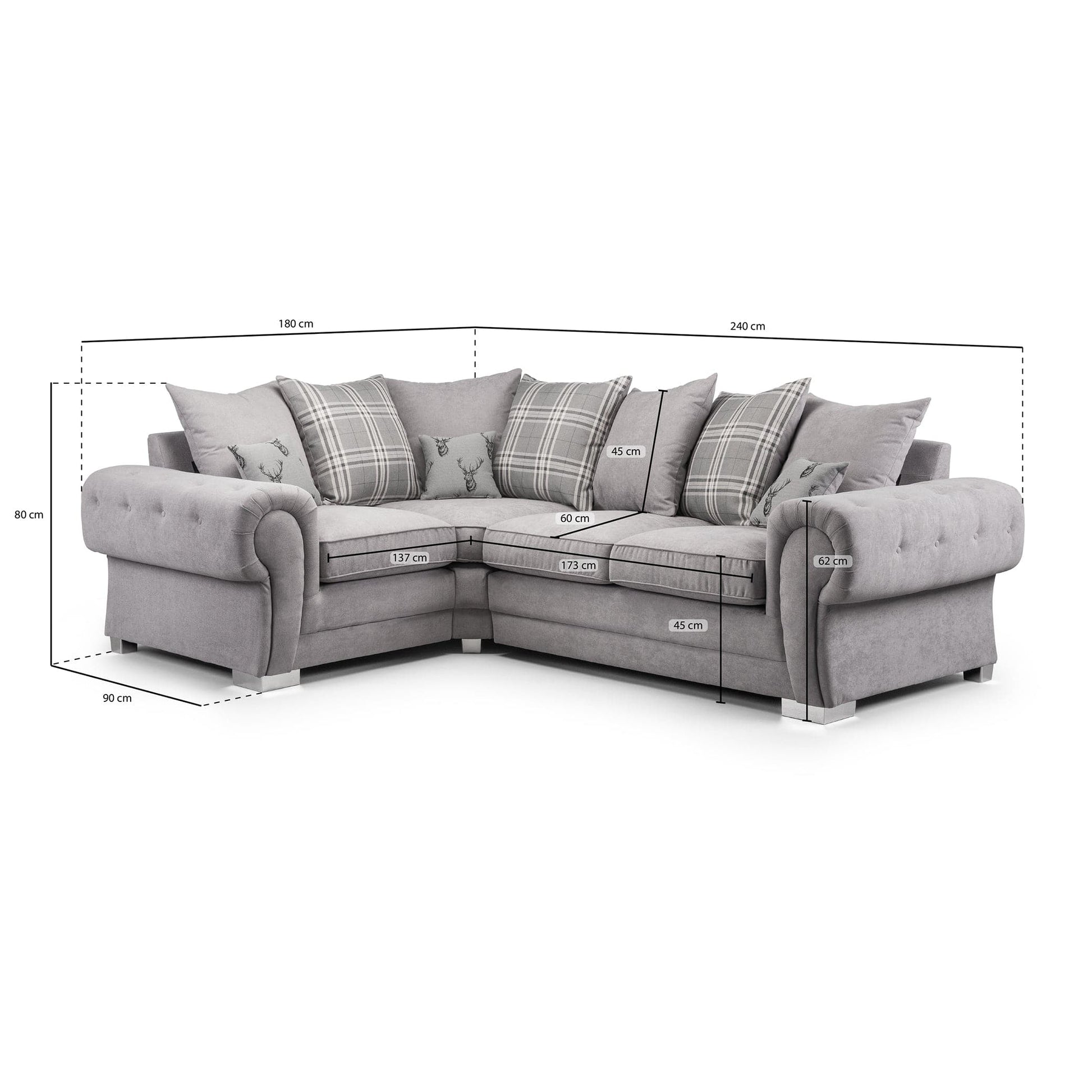 Jude Scatterback Grey Left Hand Facing Corner Sofa offers spacious seating with classic charm and contemporary style