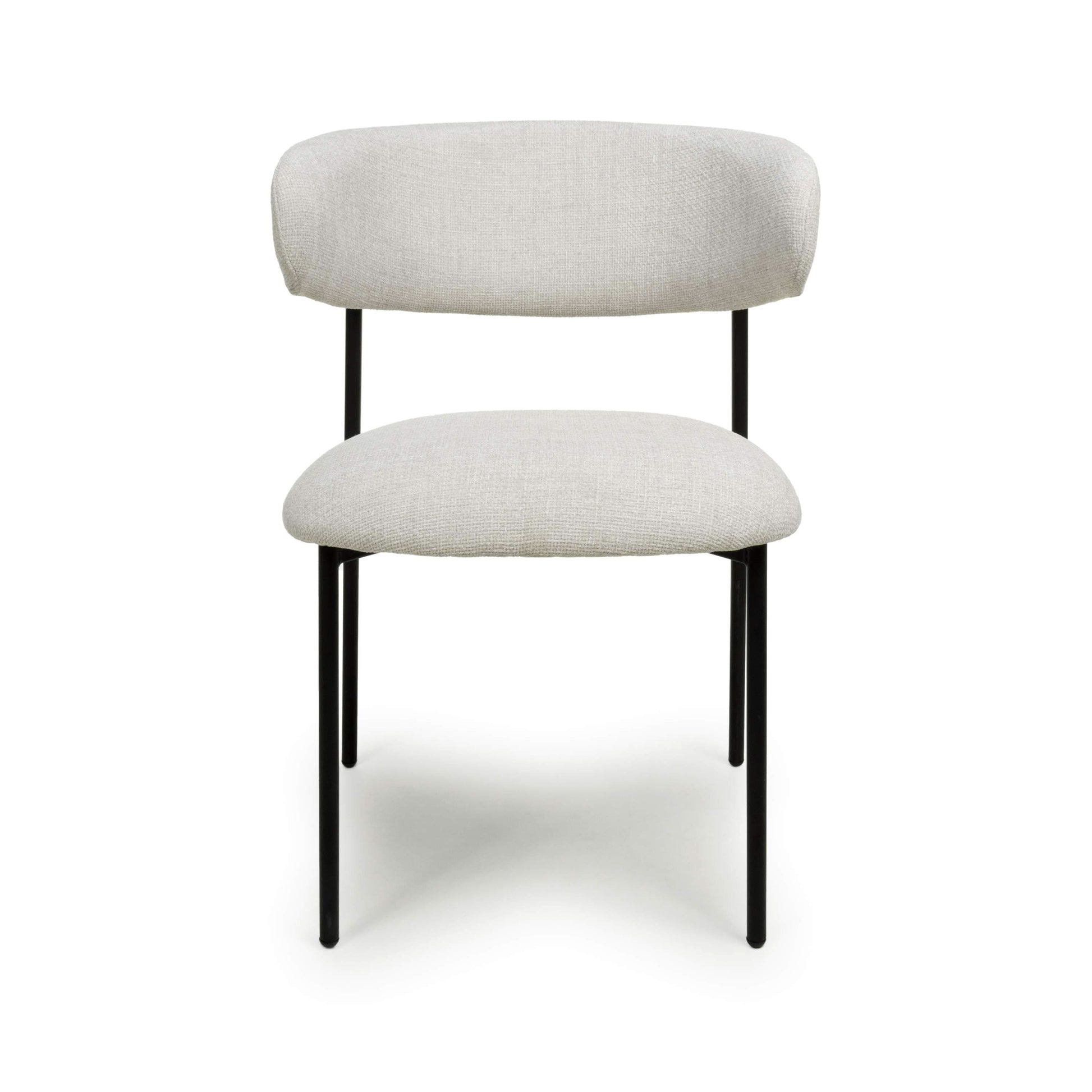 An ultra minimalist dining chair, upholstered in natural linen effect fabric. The angled deco style black metal frame supports a comfortable rounded seat pad and curved back rest. Assembly required. Sold in sets of 2.