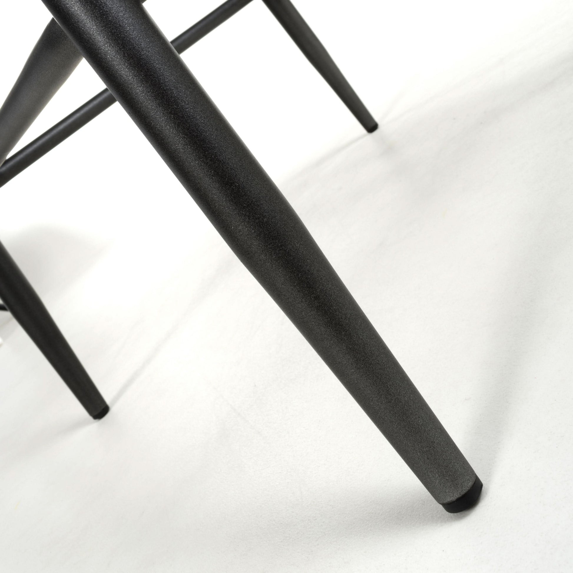 A sophisticated dual fabric bar chair with contemporary lines. The square padded seat is accentuated by sloping inviting armrests. A feature rectangular cutout highlights the curved edges of the backrest. Sleek bluey grey textured chenille covers the front of the seat, stylishly contrasted by matching corduroy on the sides and rear. The tapered iron grey tubular metal legs are supported by a curve edged square footrest. Assembly required. Sold in boxes of 2.